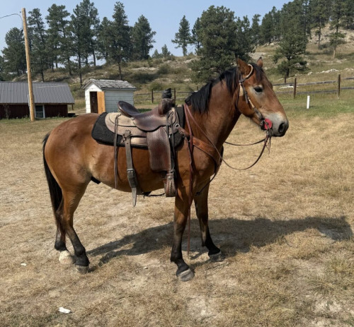 Rising 2-year-old with 40 rides on him – coming along nicely. Drives double – has been used with a manure spreader and to pull hay rake. Ranch work ready – I’ve ponied horses off of him. Good with the farrier. He is a little watchy but willing and has a solid foundation to go any direction.