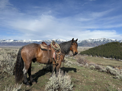 Captain, is the kind everyone needs, he is just as solid and honest as you can want. He stands just shy of 16 hands and will weigh in at 1350. He is very handy broke and will really ride around, very solid in all aspects of ranch, trail, and arena work. Great to rope on will really hold one, awesome in the mountains and on trails very sure footed and sound. He has also been headed on out of the box, makes a great practice horse, Captain is a really nice pickup horse; sounds lights and noises don’t faze him. Packed flags and even been shot off of. Gentle for the whole family and really easy to be around.