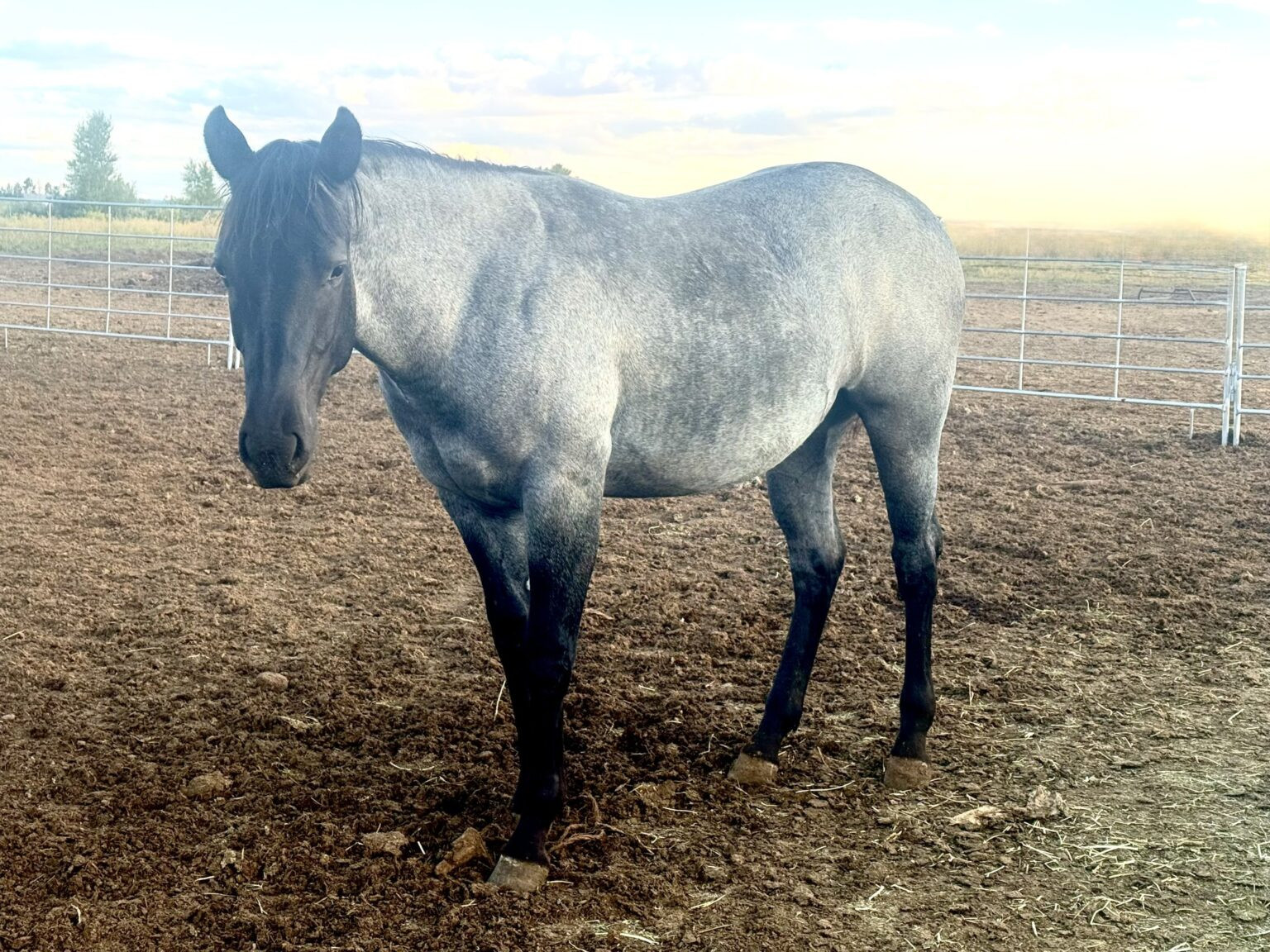 Doll is a gorgeous true blue roan that we raised since 4 months old. She’s super quiet and gentle. She is bred to go any direction and stands close to 15 hands as a coming 2 year old. We’ve owned her full brothers and they are super easy to train and make incredible mounts.