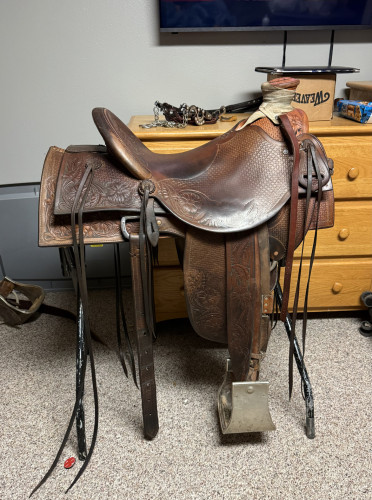 16” Fully tooled wade stamped Nancy M. Hoggan. This has been one of my favorite saddles. It fits EVERYTHING. Nancy recovered the horn and fork this summer. Comes with stirrups, latigos and back cinch. Price includes shipping, Venmo or PayPal only no trades.