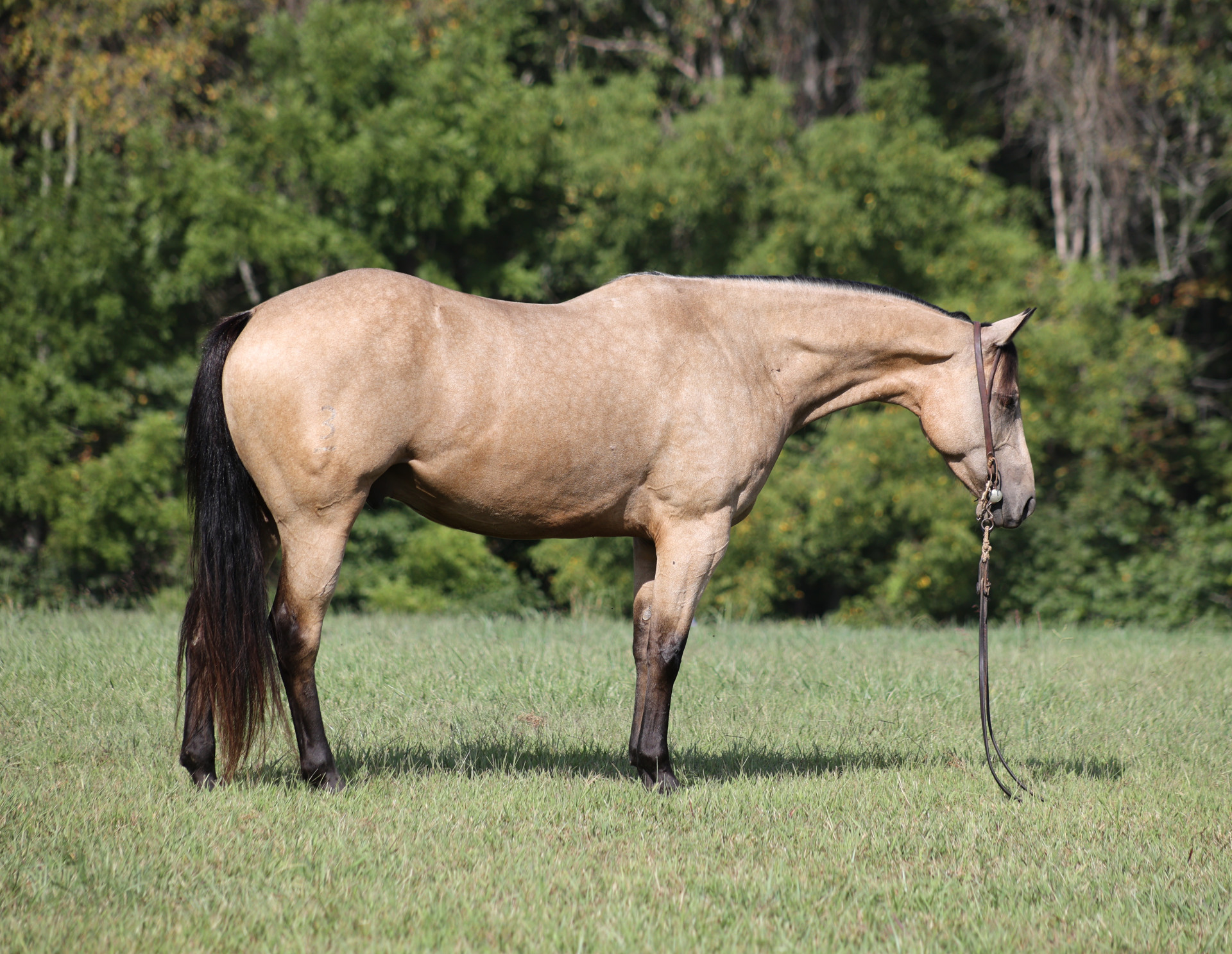 A High Rollin Shiner is a stout and I mean Stout built 15H, Dapple Golden Buckskin, Registered Quarter Horse Gelding that is a 2019 model. He is a well bred horse going back to Shining Spark! Shiner has been ridden all across the US from Oregon to Virginia with various stops in between! He is a well traveled horse that has been used as a ranch horse his whole life. From herding to sorting, pasture roping, loading trucks… he has done it all! Shiner has been trail ridden in the high country that is very rough and rocky. He will cross creeks, ditches, logs and navigate rough rocky areas. He has a smooth jog and a very smooth lope! He takes the correct leads, lopes nice circles, is one hand broke and reins around with ease. He has been exposed to all kinds of wildlife. He has been ridden many miles in the mountains of Eastern Kentucky and encountered every obstacle possible on the trail. He will go up or down even the steepest slopes, across deep creeks, over downed trees, and over all types of rough terrain while still being sure footed. If you want a horse that will get the job done, Shiner is the horse for you! Located in Hugo, OK but pickup also avaliable at out place in Kentucky. Contact B&B Quarter Horses 402-382-5846