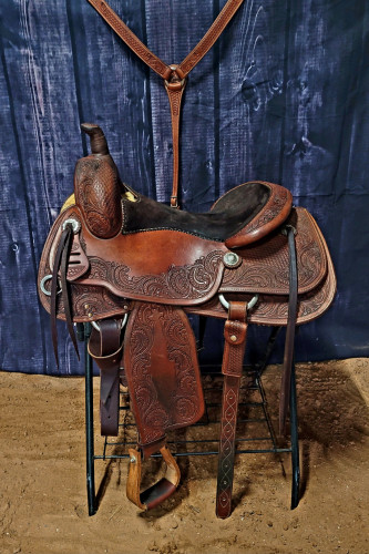 16" Bob’s Custom Cowhorse! It is a 2020 model, has a Duane Latimer Tree (their most popular tree), a dark chocolate seat, Nettles stirrups, leather billet and off billet, back cinch, and a matching breastcollar!