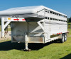 One owner stock trailer 20ft x 6.8ft model with torsion axles, electric brakes, a single center cut gate, and a rear slam gate and slider