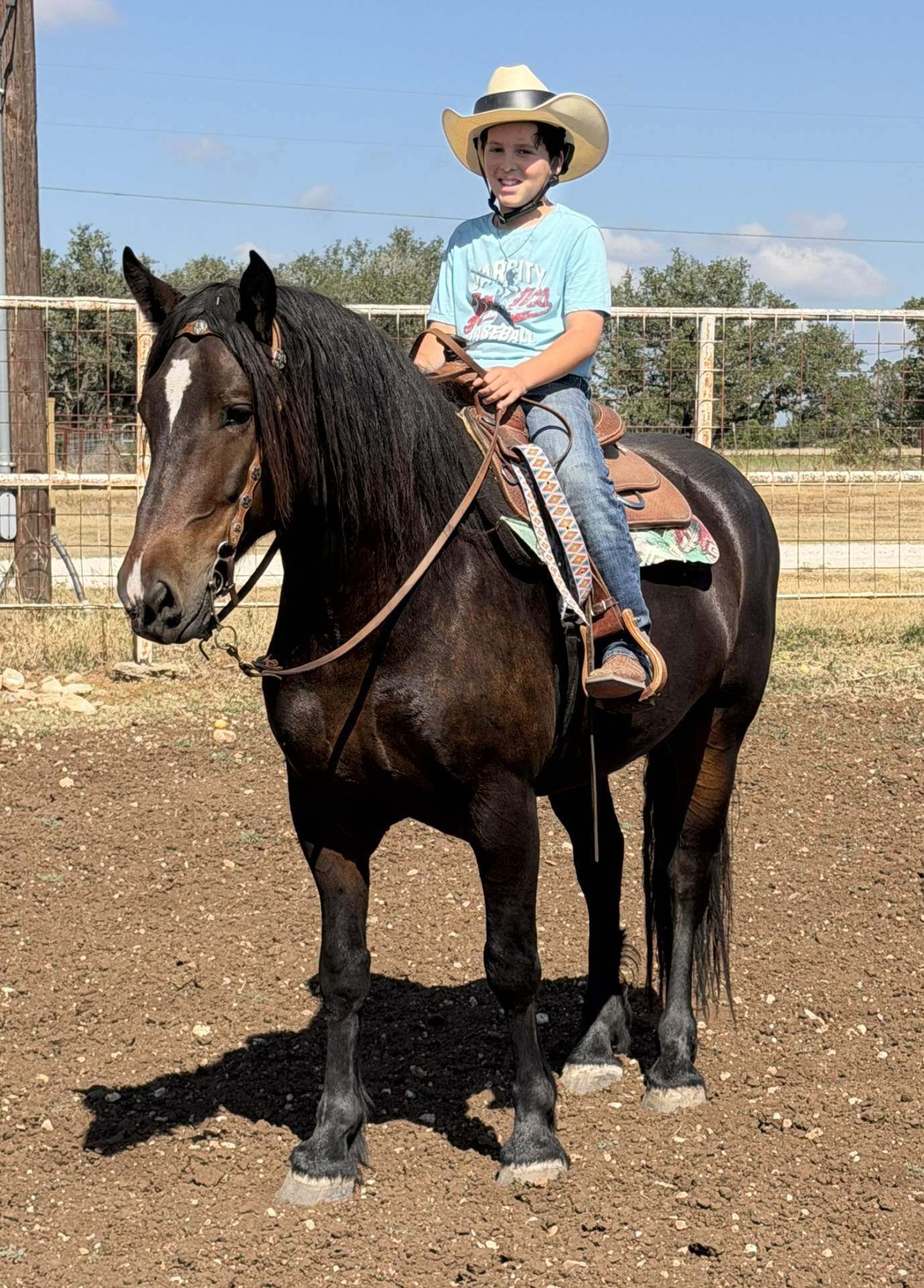 If you want a horse that will turn heads, this is it! You won’t find one much prettier, and even at just 5 years old he is gentle for just about anyone. Valor is a gorgeous 16.2 hh Percheron/Fresian gelding weighing close to 1700 pounds with a size 4 shoe. He is an absolute lovebug, with a personality as big as he is. Valor wants to be everyone’s best friend and is an absolute gentleman on the ground as well as in the saddle. He will come right up to you begging for attention if you walk into his pasture, but he is also very respectful and not pushy at all. He was bred by the Amish and was purchased at 2 years old by a man who broke him to ride and used him to pull a buggy. We do not have a buggy so we have only ridden him. Valor has been ridden both English and Western, and while he is a big boy he still fits into a regular western saddle, so no need to run out and buy a special saddle. Even with his size he is so easy to ride, with a good neck rein, easy stop, and a proper back up. Valor has the smoothest trot you could sit to all day long, but his favorite speed is slow. He will lope with encouragement but definitely prefers to walk and trot. At his size he was built for power, not for speed. 😉 He is kind and good minded and has never offered to buck, rear, bite, kick or take off, and even if not ridden regularly he stays gentle. He would be excellent for a therapy program as he is extremely good minded and not prone to getting excited. Valor will cross water without issue, is very sure footed and will go up, over or through anything you point him at. He is perfect for the shoer, no stocks or drugs required, and can go barefoot or with shoes. He rides just as good bareback with a halter as he does with a saddle and bridle, and has been ridden by both my 6 and 9 year old sons. Valor is easy to catch anywhere, gets along well with all other horses, and loads well. He will ride out alone as well as with a group, will happily lead or follow, and has been ridden down the road and in traffic and isn’t bothered by it. Asking $10000. Call for more information: Wendy at 210-363-1883 or Aubrey at 830-377-7236 or Serious inquiries only, no tire kickers! Vet checks welcomed. Delivery anywhere in the US is available.