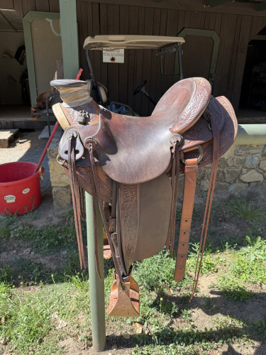 Fantastic saddle by maker D.R. Hoover. 15 inch seat. In fantastic condition, great heavy duty working saddle, fits horses like it’s supposed to! Not positive but looks like full QH bars based on measurements.