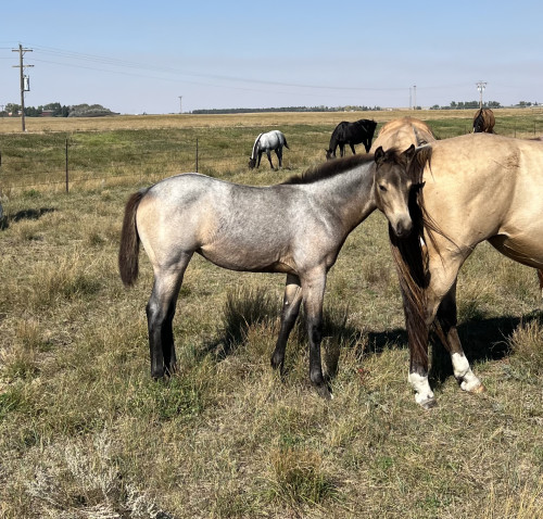 This filly roaning out was not expected but she sure is something! She has a little white on the right front but that’s it for markings. She’s built correct with a nice hip developing. This cross is super easy and friendly or atleast the colts have been so far! This is their first filly but she’s pretty nosey in the pasture so we expect a fairly similar personality to the colts. Her 2024 full brother is a ham and so-so easy. Sire is 15.2H, dam is 15.1H. Sire’s foals have gone on to performance homes for team roping, barrels, breakaway, ranch versatility, ranch riding, as well as ranching and trail partners. Dam’s oldest is a 2020. Video available. Health/coggins included if leaving Montana.