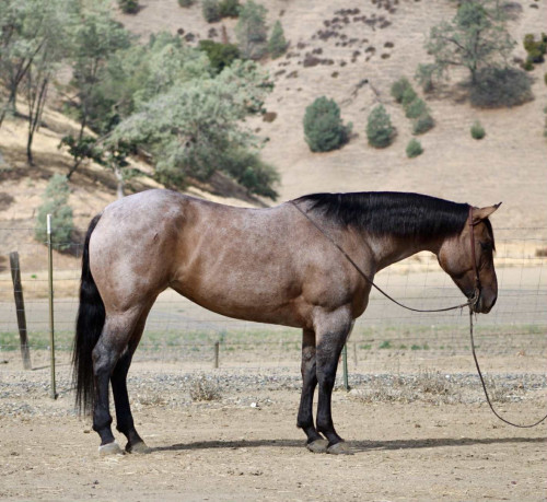 • 2021 AQHA dun roan mare, 15.1 hands, stout and correct
