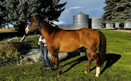 Blink has lots of ranch miles and a big motor. He is a hard-working pony with plenty of heart and try, always ready for a full day of riding and work through the hills and rough terrain. Blink can be cold-backed if left off for a period of time and is not best suited for an inexperienced rider, but our 9-year-old daughter has been riding him all summer without any issues. He does not spook and has been started in the arena, including pen roping, being put on the barrel pattern, and he has also been heeled on the Heel-O-Matic/Smarty in the past. Willing to hold for 2 weeks at no charge then $25/day thereafter.