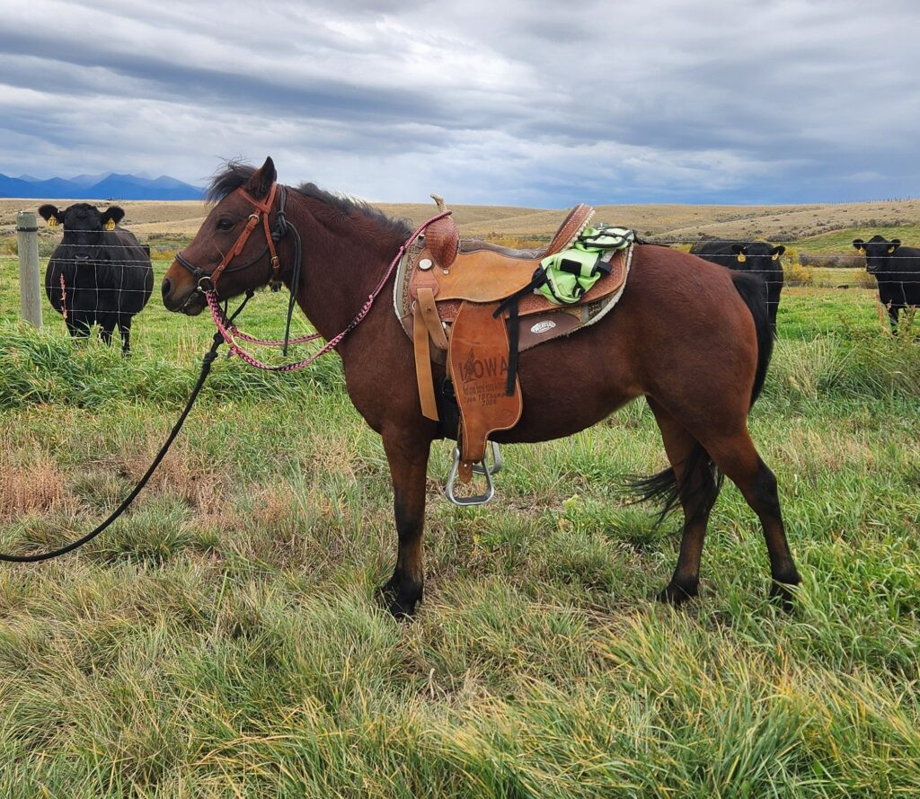 Birdy stands 11.3 hh and loves nothing more than a good trail ride or day out riding. She’ll lead a pack string or a stubborn colt, cross anything and go anywhere. Been shown in pony classes and obstacle courses, and used for ranch/cattle work. She rides like a big horse and can keep up with all the big horses too, with or without a rider. She doesn’t need a rider to join along, this pony has autopilot. Surefooted and safe, just about anybody could enjoy this pony! Stands quietly, loads easily, good for the farrier, bathes, saddles, and bridles easily. Good with all the kids shenanigans. Can pack on her also. Will hold for 2 weeks at no cost. Free delivery up to 100 miles and up to 1000 or more miles at cost.