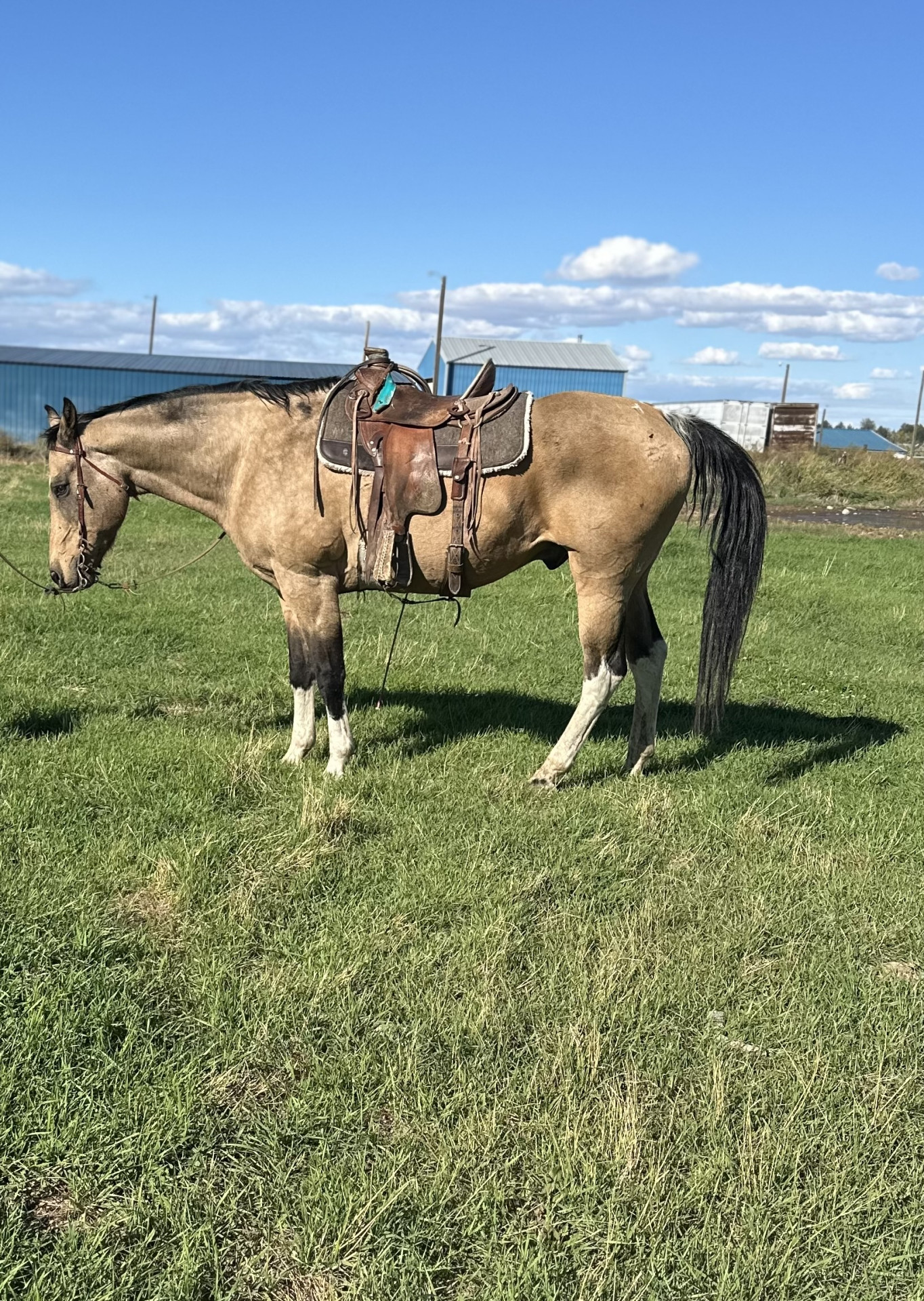 He is a handsome 16 year old buckskin gelding who stands 16.1hh. This handsome fella is a been there done it horse. Anywhere from a family horse, to 100% kids horse, to a pickup horse at pro rodeos. To heading and healing in the arena on a Friday night roping with family and friends. Chrome has been all over the ranch from pushing cows, Gathering cows, sorting, doctoring, and branding, he crosses water, bridges, dead fall, loads, and stands great for the farrier. He walks, trots, and canters he rides as smooth as an old Cadillac. Chrome is really good in the arena. He has a big motor. He knows what to do the second he enters it. He would be great for a young man in high school. If he’s looking to go to the top in the rodeo career, Chrome will take you there, no hesitation asked. Chrome has been in parades. He’s been used on the trail. He will come with a full set of shoes. And a new halter for his owners.I am willing to hold Chrome for up to ten days. After those ten days, a fee of $10 will be charged per day.FMI call Larry Babcock 208-807-1740