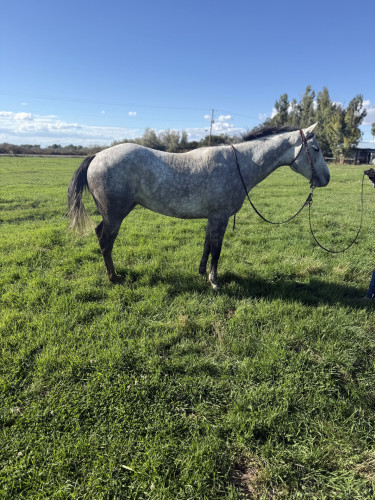 Keeper is a cute 6 yr old dapple gray gelding he stands 15hh. Keeper has had 60 days of training and is coming along great. He needs a job with long days. He is easy to catch, loads and stands quiet. Great for the farrier. Keeper, with 6 more months of riding, could go any direction from a rodeo prospect to just a good ol’ ranch horse. If you’re looking for a handsome boy. Or a really pretty eye catcher. He would make a good winter project to get ready for spring. Keeper loves attention. will come with a new set of shoes and a halter.I am willing to hold Keeper for up to ten days. After those ten days, a fee of $10 will be charged per day.FMI call Larry Babcock 208-807-1740