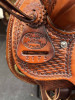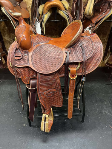 This saddle features a 15.5" hard seat, 6 3/4" gullet, FQH bars, Rawhide wrapped wood tree, post horn, 4 1/2" cantle with rawhide trim, pre-twisted stirrups, round skirt, 6 leather ties, 7/8 drop rigging, fleece is really good, and weight is around 40lbs.