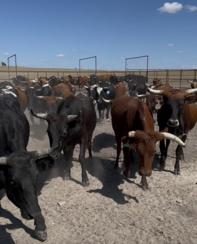 65 corriente heifers that have been running with 2 black corriente bulls. Preg checked 10/13/2025. 3 wet, 54 bred(mostly heavy bred), and 8 open.