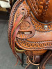 This saddle features a 15" hard seat, 6 3/4" gullet, FQH bars, Rawhide wrapped wood tree, post horn, 4 1/2" cantle with rawhide trim, pre-twisted stirrups with new angles stirrups, matching breast collar, round skirt, 6 leather ties, 7/8 drop rigging, fleece is really good, and weight is around 40lbs.