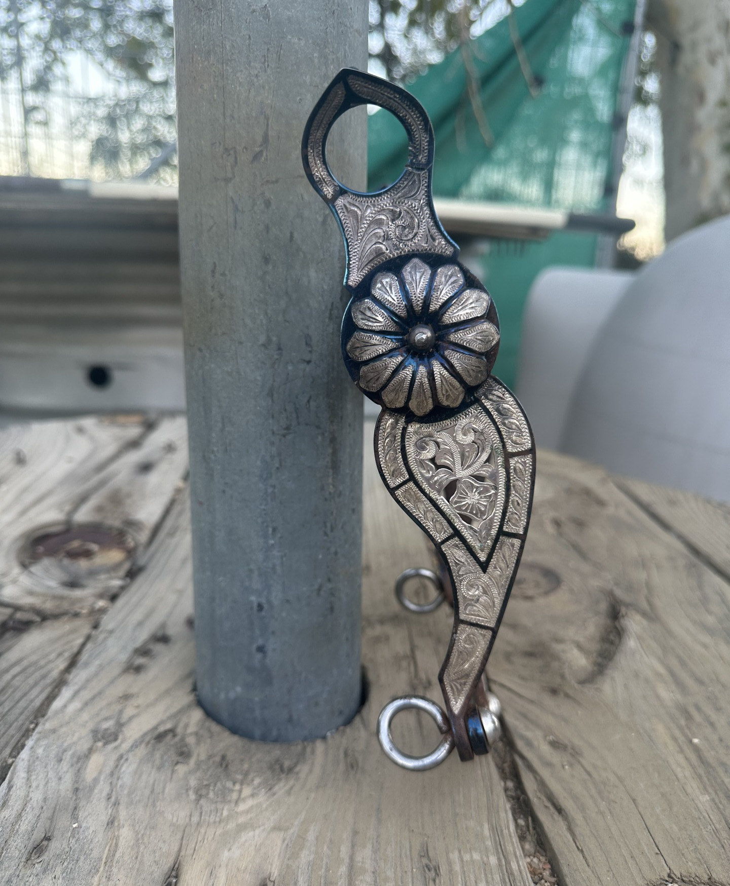 This is a custom Garcia bit Serial Number #16299 made by the J. M. Capriola Company in 2013. It is a #728 inlaid blue steel with a filigreed cheek and a large desert flower with a roller bit mouthpiece. The bit has light use and is in good condition, but has some rust from storage. I have papers authenticating the bit that state that I am the owner, what the bit is, the serial number, and that it was made by the Garcia Bit and Spur Co. in Elko, NV in 2013. The paperwork also shows the custom order.