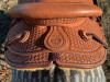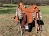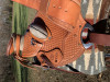 Custom built 16” basket stamped wade. I built this to be my personal saddle but circumstance led us to end up being out of the Ranching culture for the time being so I’m letting it go so it can be used as it was intended for. Built on a custom BILL BEAN tree. 92 degree bars. 4.5x12 cantle. Guadalajara horn measuring 3” tall, 5” wide, 5 1/2” long. 7/8ths in skirt rigging for closer contact to the horse as well as lightweight. Saddle weighs 43 pounds total. The buck rolls have the Jeremiah Watt forms in them for uniformity. 5” wide Visalia Stirrups. Matching breast collar, custom 32” roper cinch included. The saddle strings have been edged for a smoother fit in hand. Saddle was on a horse one time for Pictures.