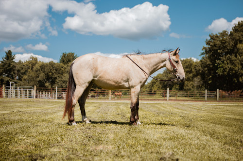 JJ is a true Mustang from the west, but don’t let that get in the way of seeing all his amazing talent. He stands 13.2 and is packed full of talent. From his incredible stop to jumping and roping, JJ has been ready and willing to please in anything we have asked him to do. JJ is a very athletic mover, light on his feet and smooth in all gaits. We have used him all over on the farm and taken him to town to see the sights. JJ has been hauled here and there to practice roping pens and rodeos and handles all the commotion and chaos like a champ. He is light in your hands and on your leg, giving to the bridle and easily moves shoulders, hips and side passes. Out on the trail JJ has crossed rivers and streams, tread through the mud, climbed up and down hills and crossed over logs. He is easy going whether he’s in the front of a group, in the middle or brining up the rear.JJ loads great and hauls well. He has been hauled to several over night camping trips and stands quiet at the hitching rail. We have rode JJ many miles in both English and western tack. Here at the farm, JJ lives out on a lot with a couple other horses. He is not a bully to other horses but also not on the bottom of the pecking order. He is a super easy keeper and requires no maintenance. He is easy to catch outside and when stalled, JJ is very mannerly and easy going. In and out of the arena JJ has easy gaits, smooth transitions and he guides well on a neck rein. JJ has been my go to ride most of this year, and I’m sure that once you swing a leg over him you’ll understand why.