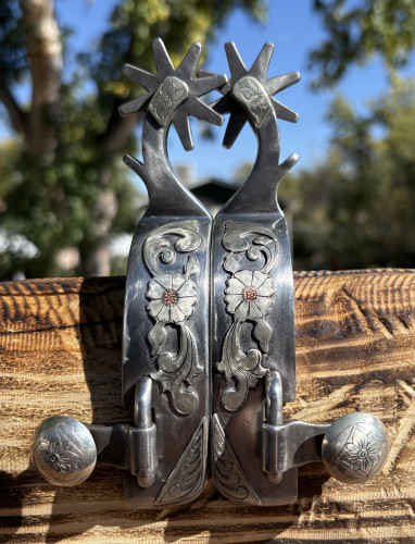 Custom, hand-made, one of a kind ladies spurs. Feature 1”, tapered band, 3 1/8” heel opening, 1 and 5/8” shanks, and 1 1/2” 8-point rowels. Feature matte finish for that subtle old-school look. Single mounted with nickel and copper. New condition.