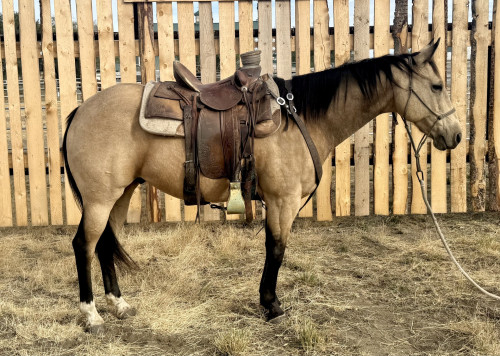 Sweet Blue Yonder is an AQHA 2013 Buckskin gelding standing 14.3 HH. He had a later start in life and is sound and ready for miles on the ranch or trails. Lots of talent & an easy mover with a great natural stop. Has had a rope swung & played with the heel o matic but no live animals roped yet just rode out through cattle around the ranch & in forestry. Would be best suited to an experienced rider with a job for him to do.