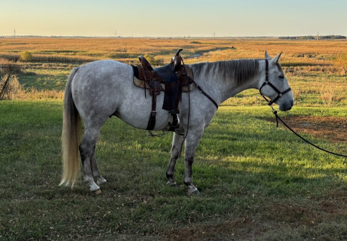 Nice, big, 15.3 hand, gray gelding by Salty Texas out of Texas High Dasher. Out of a dam that is Ronas Ryon and Speed Doctor. This horse has been used on the ranch, broke with all the bells and whistles. Horse is very athletic. Clips, loads, ties well, trims all good. Safe for anyone to ride. Would make an excellent head horse or pickup horse prospect. Sells sound and safe. Reason for selling is going to college.