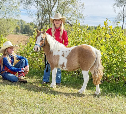 Uno is a very special pony with unique looks to boot. This little pony has an eyebrow over his left eye. Making his true personality shine. Always curious, confident, kind, and up for anything. Uno loves going on trail rides, roping the sled, and has started pulling the cart. He will make a great family pony.
