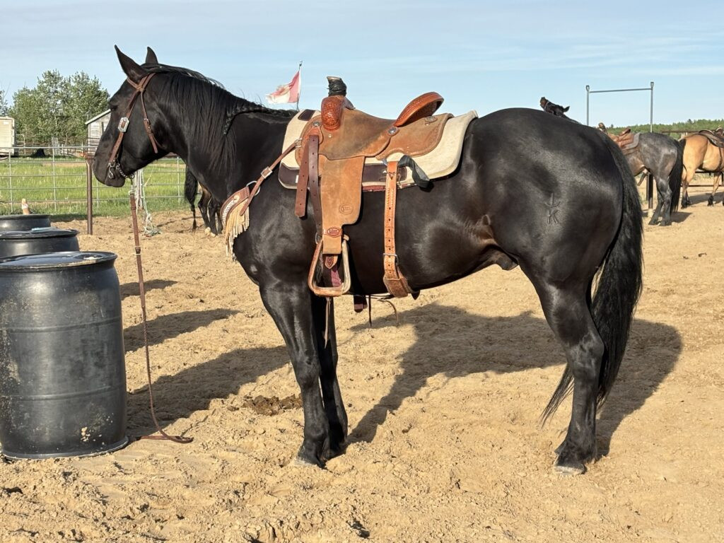 Spider-Man is as good as they get. He is a good looking, fancy, eye-catching black gelding, standing at 15 hands, with a thick hip and athletic frame. This horse will catch everyone’s eye and is the ultimate all round horse. He is a switch ender, as a head and heel horse, has been a breakaway horse, a barrel racing horse and will also rise to the occasion as a haze horse. He has been to many team roping jackpots, and seen it all at the rodeos, running barrels and being used when and where needed. Spider-Man has been used everywhere, he has been to the mountains tail riding, used in the pasture gathering, treating, and pulling bulls. He is strong off the horn and reliable, Spider-Man will go all day long, with no quit, he uses his body right and is enjoyable to ride. He’s been used by our whole family and covers all the bases.