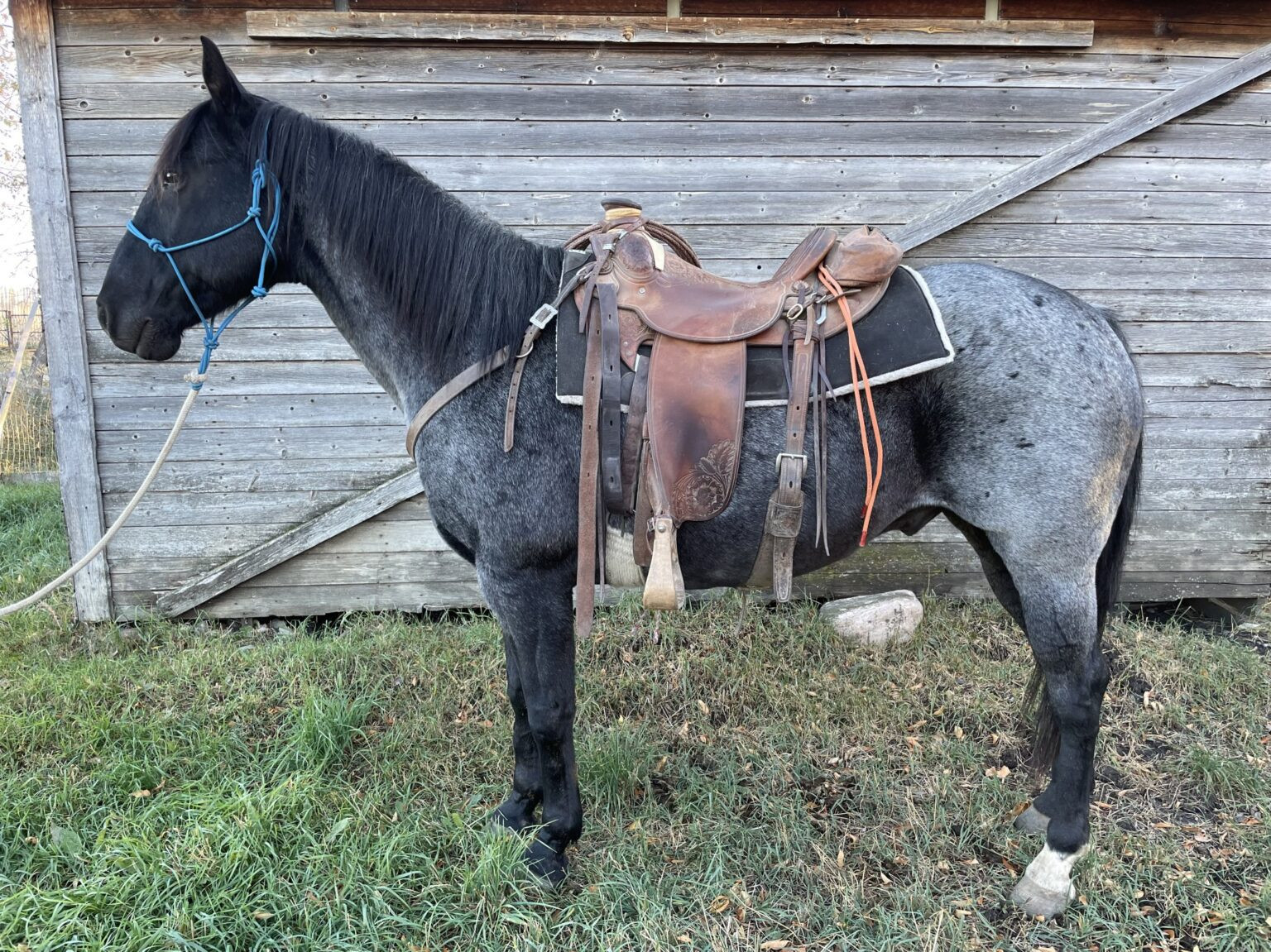Standing at 15.2 and wears a size 1 shoe, Steel is a true blue roan with only one white sock. He is a solid ranch horse and a go to. Seeing all aspects of ranch work from gathering, roping, sorting and being packed, Steel is an all-arounder. He’s been a great horse to have around and is always willing to do the job. Best suited for an intermediate to confident rider. Stands for farrier.