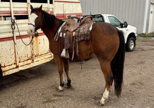 Big pretty gelding that has been used on the ranch doctoring, moving cows, and ridden in all types of country. He has been an older gentleman’s go to horse and has no bad habits. This horse is good on the ground, easy to shoe, and has a very smooth gait.