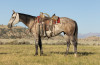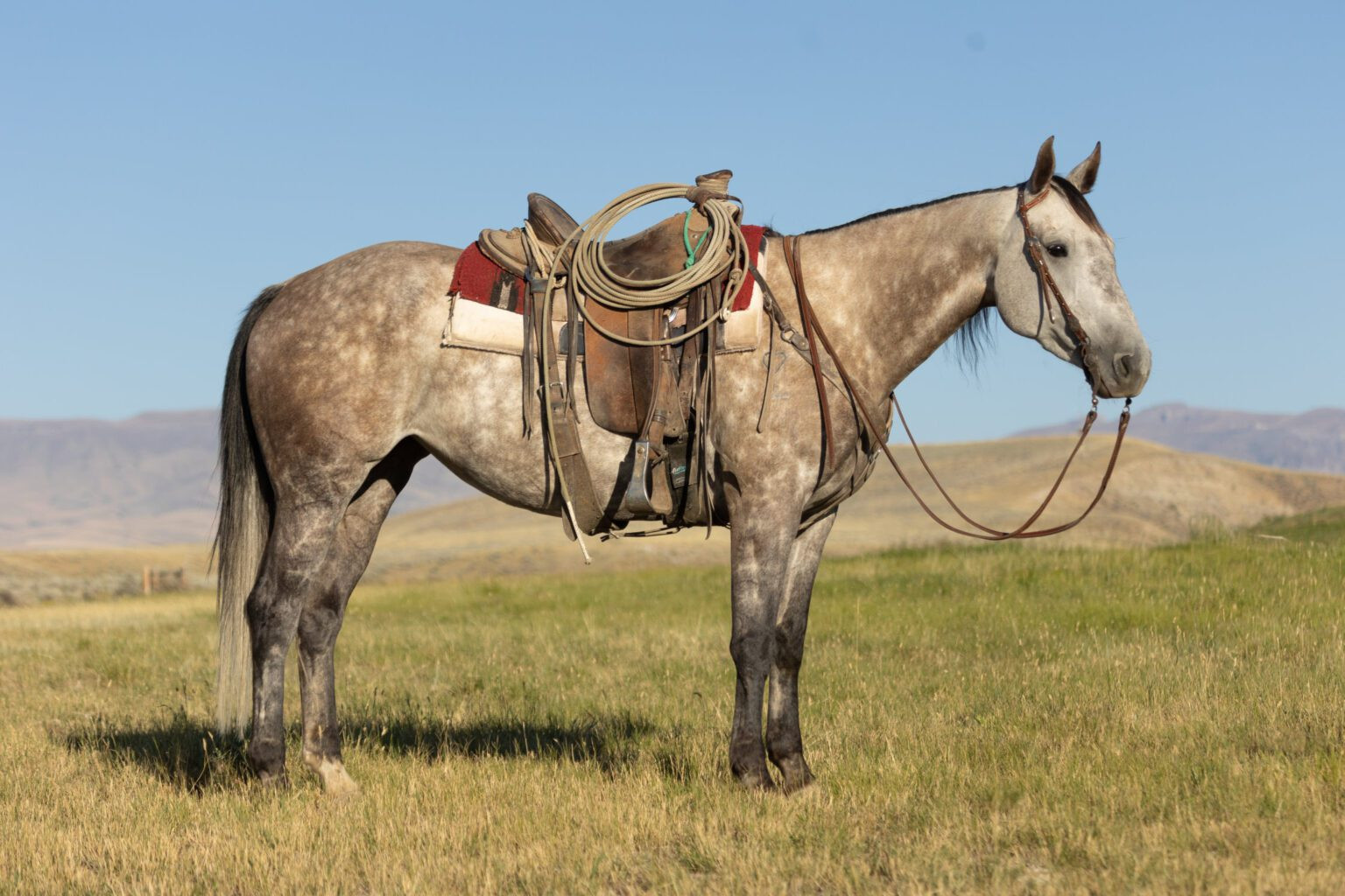 We bought Jenny from the breeder and has gone through all the steps of our program. She has been used extensively on the ranch from gathering, sorting, branding and doctoring many yearlings. She packs very well, leads great in a string, hobbles out, and ties great. Have packed meat, horns, and camp materials. Good to shoe, saddle, and hauls well. Tough mare with a good long trot, has plenty of speed to catch fast cattle and tracks and rates well. Gentle minded mare that has a good motor to her and would fit somebody with average to above average experience.