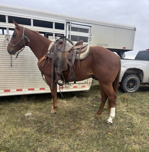 14.2hh. Mig is an athletic, well bred gelding that has seen lots of miles gathering and checking cattle. He rides through the trees and up and down hills with no issues. Mig lopes around nice, sidepasses and is started on his turn arounds. He is ready to go on with as a rope horse or keep ranching on. Would also make a good team penned or sorting horse.