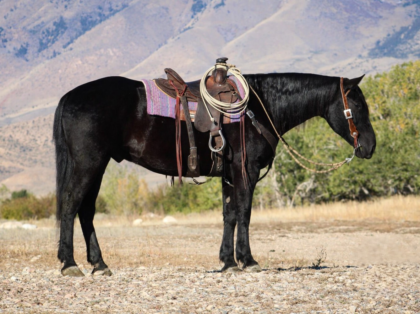 Black is just the most gentle gelding. Beginner friendly to ride, drive or pack. We have had him since he was a yearling and have done everything with him. He has done all the ranch chores, you can rope one him. He’s a solid mountain horse for hunting and packing. He has been driven for miles. Our kids ride him everywhere. All ages and skill levels can get along with Black. He is beginner friendly. Black is 16.2 hands tall but he will side pass up to anything and stand patiently for you to get on or he is taught to lay down on cue making him easy to mount anywhere. Nothing bothers him, he has that gentle natured draft horse attitude. Slow, steady and solid no matter where you take him or who you hand him to for a ride. He also rides well in the arena. Has a super smooth rocking chair lope, easy trot and an excellent correct stop. We do not receive text messages. Please leave a message and I will call you back.
