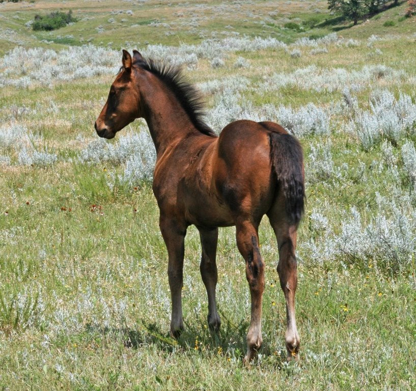 This colt is straight and correct with a shape you could look at all day long. He will excel in the show pen and the rodeo arena. Big Gun will have a long ground-eating stride and be super smooth to ride. A dark mahogany bay that doesn’t have a white hair on him. He should mature around 15hh. Sire and Dam are 6 Panel negative. Weaned for more than 60 days, well started on feed and halter broke. Eligible for all AQHA Ranching Heritage Challenge Programs.
