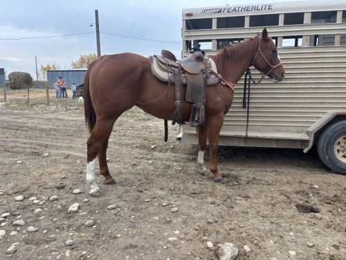 15.1hh, good looking, straight legged, flashy sorrel gelding. DW has seen lots of ranch miles as well as used in the feedlot checking cattle. Started in team roping on the head side. DW is bred to go in any direction you want whether it is roping, barrels or any timed event in the arena.
