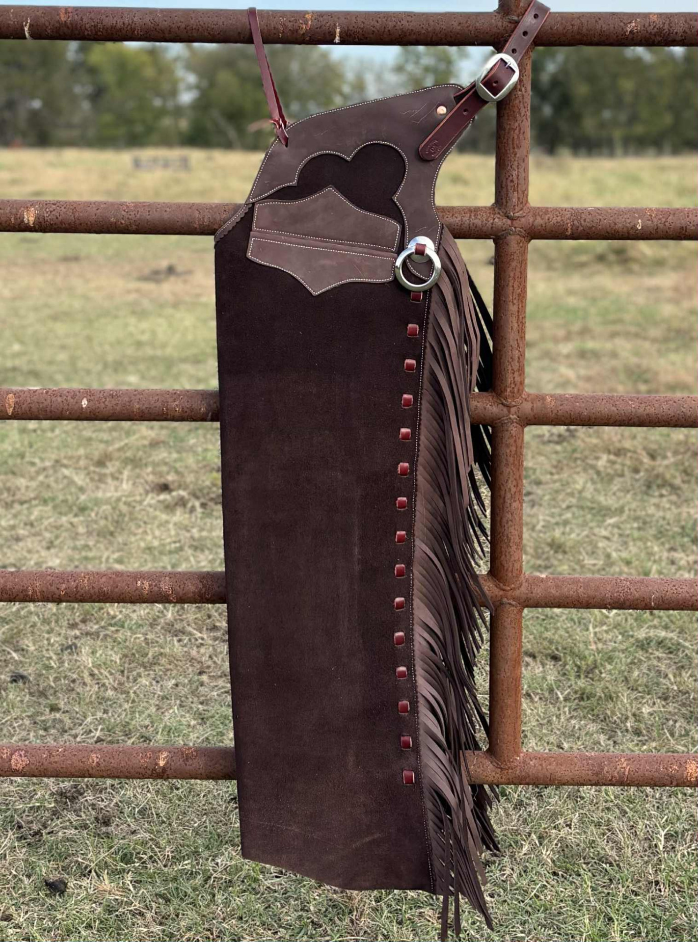 For Sale: DIXON CHAPS Plum Rough Out Full Zippered Shotgun Chaps with Fringe (#317) #203757