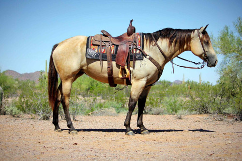 Miss Josies Song... Who doesn’t love a big beautiful dappled buckskin! Josie is a 5 year old AQHA mare who stands 15.3 hands tall. She is a big gentle giant and absolutely loves her people. Josie started out as a ranch horse and has done every job on the ranch from roping to sorting to gathering cattle. She keeps a level head in all situations and enjoys working and having a job. For the last year Josie has mainly been a go-to pleasure and trail horse. She will cross and go through anything you ask her to, has a nice ground covering walk, and travels out on a loose rein alone or with others. Josie has been ridden by all levels of riders and adjusts well to who is on her back. She has never offered to buck and stays gentle even with time off. She has also carried the flag and it doesn’t phase her at all! We have done the trail course obstacles with her as well and she is brave and willing to try whatever is asked of her. She would also make a wonderful barrel horse or head horse prospect. Josie has wonderful ground manners and an in your pocket personality. She stands tied, bathes, loads and hauls nicely. She is currently barefoot and has no issues and requires no maintenance. Josie is ready to find her person to adventure with! She is located in Marana, Arizona and we would be happy to help arrange transport anywhere. She will come with a current coggins and health certificate. Please feel free to call or text Claire Siebols with any questions at 435-899-0508