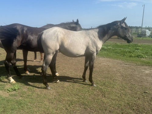 Looking to add a versatile prospect with true outcross bloodlines, a trainable mind, and eye-catching color? This filly checks all the boxes. She’s built right — good bone, strong feet, correct conformation, and projected to mature around 15.1-15.2 hands.She is Homozygous Roan.