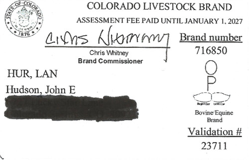 Colorado cattle brand for sale. Two letter brand includes original deed filed March 22, 1917. Assessment paid through Jan. 1, 2027. If interested, email me @ john.jors@gmail.com