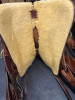 This saddle features a 15.5" rough-out hard seat, 6 1/4" gullet, SQH bars, 6 long leather ties, mule hide wrapped horn, leather rope strap, 4 1/2" rawhide bound cantle, 7/8 drop rigging, matching McCall breast collar, back cinch, new front cinch, pre-twisted angled stirrups, fleece is in great shape, and weight is around 45 pounds rigged.