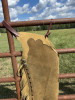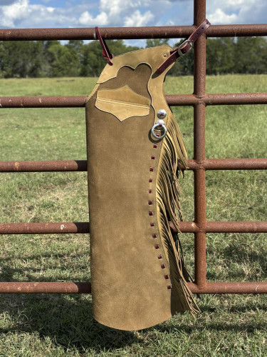 Made in the shop of DW Dixon Saddles by Kat Dixon. Olive Rough Out Small Bell/Shotgun Hybrid Chaps with Fringe.