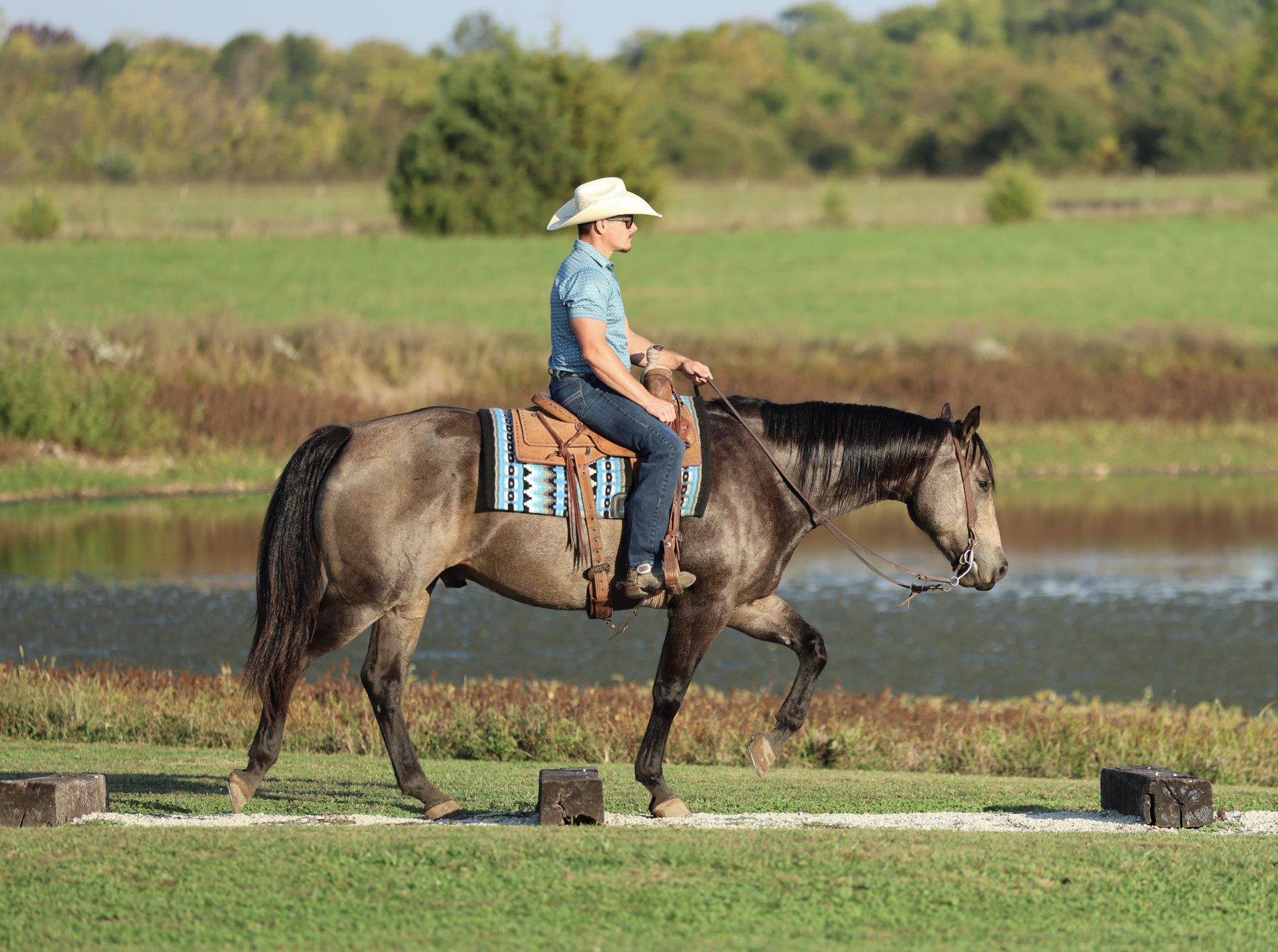 If you can appreciate a gelding that is tall, dark, and handsome then you will have hit the jackpot if you end up Captain Buck Willy. There is not a whole lot not to like about Shooter, he sports a lot of substance, ride ability, and easy going disposition. He is that stunning sooty buckskin color throughout, the kind everyone stops and stares at. Shooter has plenty of bone, strong feet, big hip, strong shoulder, and the prettiest head to top it off. He is ranch bred through and through, making it easy to see where he gets his looks. He is built to last. Shooter is calm and confident on the trails. He can cover some rough terrain like no one’s business, always staying solid. He goes through shallow creeks or vast rivers with no issues. Shooter is confident traveling down steep and rocky hillsides and will briskly go up one as well. He has been ridden down gravel roads with passing traffic and crossing low water bridges, never wavering. Shooter goes across all of the obstacles we have put in his way and will carry the American Flag, he sure looks good doing it too! He has been used in the pens working cattle all day. Shooter has a nice handle, good ground manners, and a joy to ride. We think he would make a great ranch versatility or rope horse, but if that isn’t your thing he is content toting his next partner down the trails.