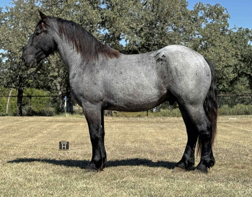 Vance is a solid made blue roan Percheron/Quarter Horse cross gelding standing 16 hands. He is put together perfectly and heavy boned while still being athletic! Vance is broke to drive single and double. He is broke under English tack as well as Western and has proven gentle in every aspect. We have started Vance lightly over fences to see his potential and he shows a lot of potential. We have hauled Vance to the ranch and on several trail rides and he has proven to be solid, quiet and easy going. He is sure footed and will go anywhere asked of him. He will lead or follow the group and is happy to go off on his own. Vance is traffic safe and has been ridden and drove up and down the highway and back roads. In the arena Vance has 3 solid gaits and easy transitions both up and down. He is well started in a bridle and will also ride in a snaffle bit. We will drag anything and has been exposed to all the scary things which he handled very well. He will stand quietly for mounting and dismounting. Vance hauls well, gets along with other horses, stands tied, bathes, etc. He has good ground manners and is good for the farrier. We have seen zero nonsense, buck, bolt, etc from Vance. He is an easy keeper and very sound. FMI call/text Chanel with Holland Horse Company 559-978-6320. We are happy to answer questions and help arrange shipping! Located in Jacksboro, TX.