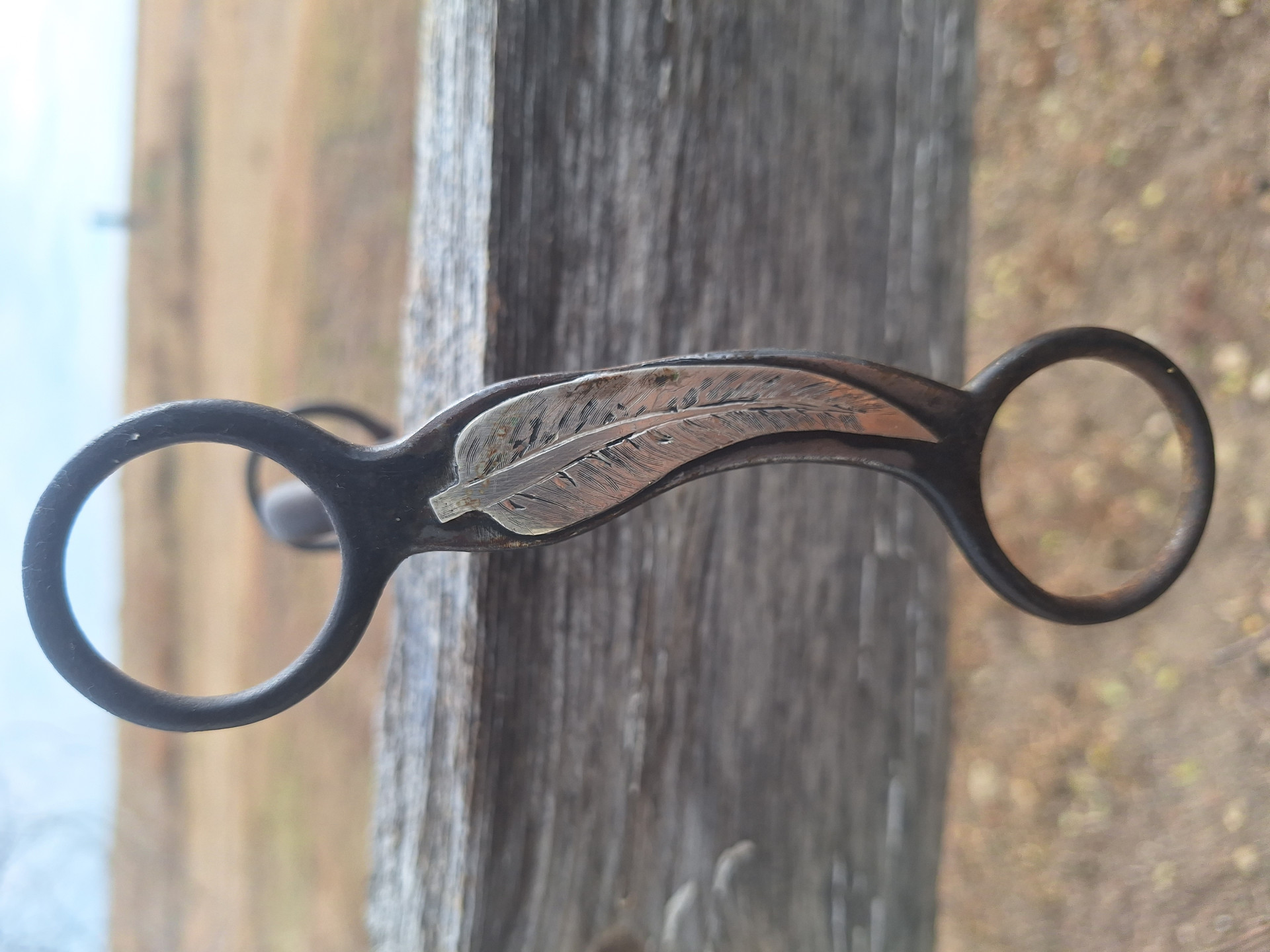 Very rare RL Causey made bit. I believe the feather mounting to be coin silver or sterling, it’s not nickel or German silver. Marked RLC on the mouthpiece. Shows a little wear at the ends of the mouthpiece, where it meets the shank. Don’t see very many of these. A finely made, collectable bit. Asking $1000