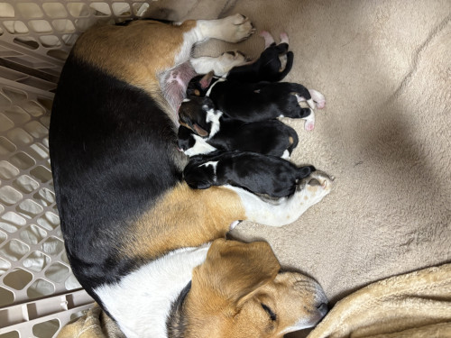 AKC registered Beagle puppies. 1 female 4 males all tri color. Born on 10/30/2025. I will give 1st set of shots at 6 weeks old with vet exam. $1500.00 total minus $300.00 deposit to hold. The last two pictures is dad. mom and dad on site. Puppies can go to new home the week of Christmas.