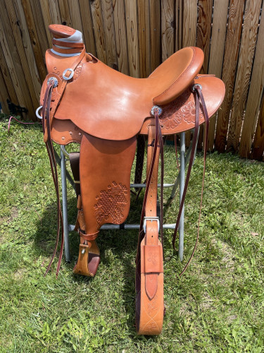 Wade saddle made by seller. On a 16” Dusty Smith tree, comes to about 15.5” finished. Motherhubbard rigging and skirt. 20” fenders to fit a 34”+ inseam.