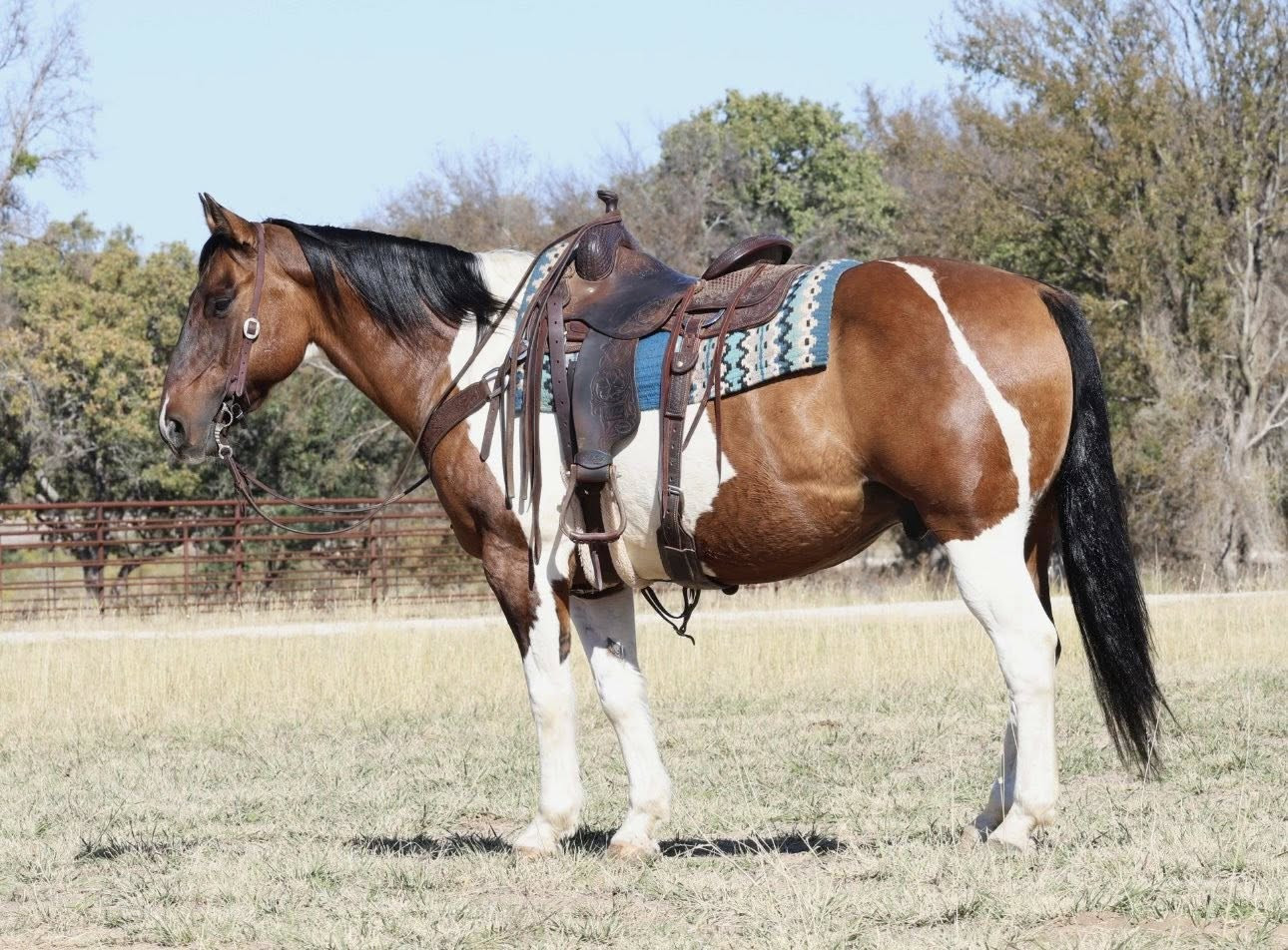 When Luxury and safety are on the top of your list then this is the gelding for you! Fancy colored and the total package family horse. Affectionately known around the place as “Romeo”. He is a 10-year-old Dun and White Tobiano Paint gelding. Romeo is as pretty as a picture and he turns heads everywhere he goes. Whether you’re showing off in the arena or cruising down the trails; he will always be the classiest one around. He doesn’t just show up. He shows off. Romeo stands 15h and is very thick made. He wears a size 1 shoe and is shod currently on all 4 feet. We have ridden him everywhere on our ranch and done just about everything you can do horseback with him. We gathered and sorted cattle with him, hauled him to the ropings and used him to clear the arena and push cattle back up. He is one hand broke and is very gentle. He has a calm demeanor about him, and we believe he would suit pretty much anyone who can hold the reins. Romeo will lope around the arena with cadence and catches both leads. He will side pass and open and close a gate. He has been desensitized to all the props, equipment and kids around here and isn’t a spooky horse. We really enjoy this gelding, and he is easy to have around. Check out his video and give us a call. 406-897-4717 We are in Graham Texas and we can help arrange shipping nationwide. I am willing to hold Romeo for 14 days at no cost.