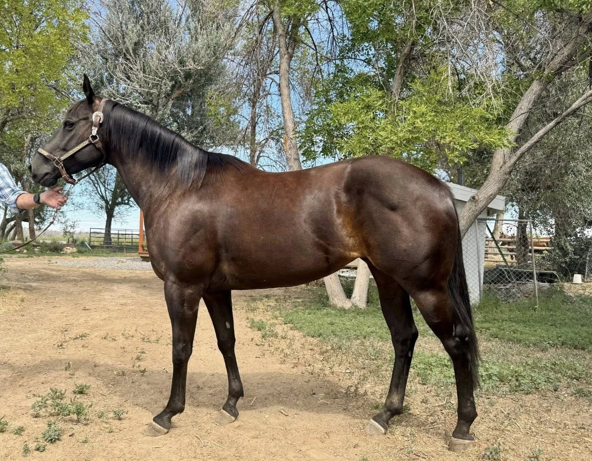 PF Ima Hot Babe is a classy 5 year old 15h brown mare that has been started right and introduced and used in many aspects of ranch work, trail riding, and in the arena. Two years ago, Tadpole had a knee and stifle injury but with time off we started riding her again, however her front right knee swelled a touch as we began arena work. X-rays showed small bone spurs on her right knee. The vet suggested some time off so she is confirmed in foal on October 13th to an outstanding buckskin stud, ETR Reminics Rebel for a 2026 June foal. She is being offered as broodmare sound but moves well in all three gaits. This maiden mare is great to be around, catch, load, shoe, and bred really nice live cover. Her pedigree and conformation is full of proven athleticism and speed and her colt should be a nice one crossed with Reminic, Zan Parr Bar, Doc O Dynamite to perform any job. She has current coggins, up-to-date on 5-way, West Nile, worming, dental, and farrier. She is a great addition to any program. Willing to hold free of charge for up to 10 days, after that $10 per day. I will haul up to 100 miles free of charge. 406-321-1414