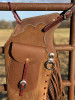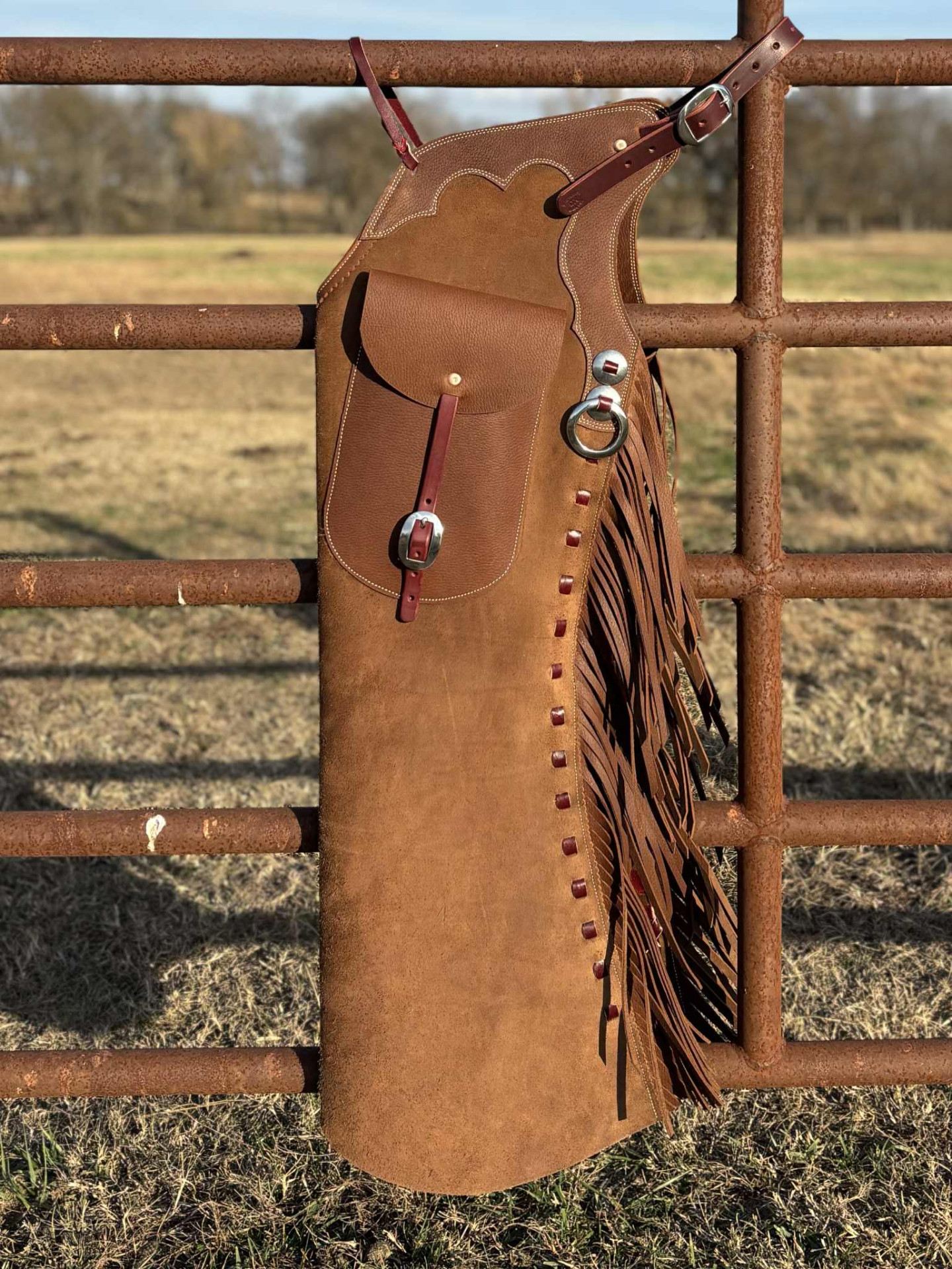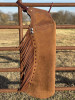 Made in the shop of DW Dixon Saddles by Kat Dixon. Amber Pebble Rough Out Small Bell/Shotgun Hybrid Chaps with Fringe.
