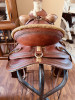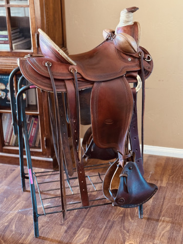 15 1/2 inch Gary McClintock one of a kind saddle. Includes breast collar, saddle bags, canteen. Beautiful saddle.