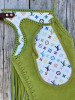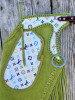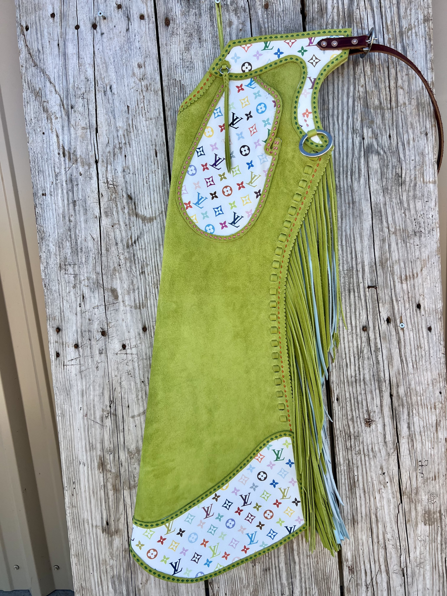 One of three pair available from the Cowgirl Luxe collection. Lime green leather in a 5.5 ounce weight. This leather has a slightly softer lay and feel compared to my usual leather. The yokes, pockets and stiffeners have the Louis Vuitton inlays. Two rows of fringe and multiple colors of kangaroo buckstitch lace.