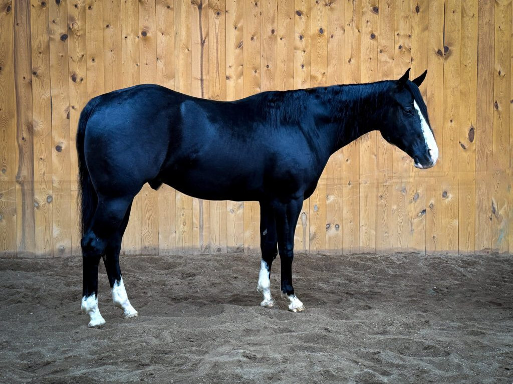Loper is a coming 4 year old, 15.2 hand gorgeous black gelding with a big blazed face and 4 white wheels. We started him ourselves and he’s ready to go on with. He has excellent foot and bone and is built to last and handle a days work. You don’t find many with the looks and color of this one!